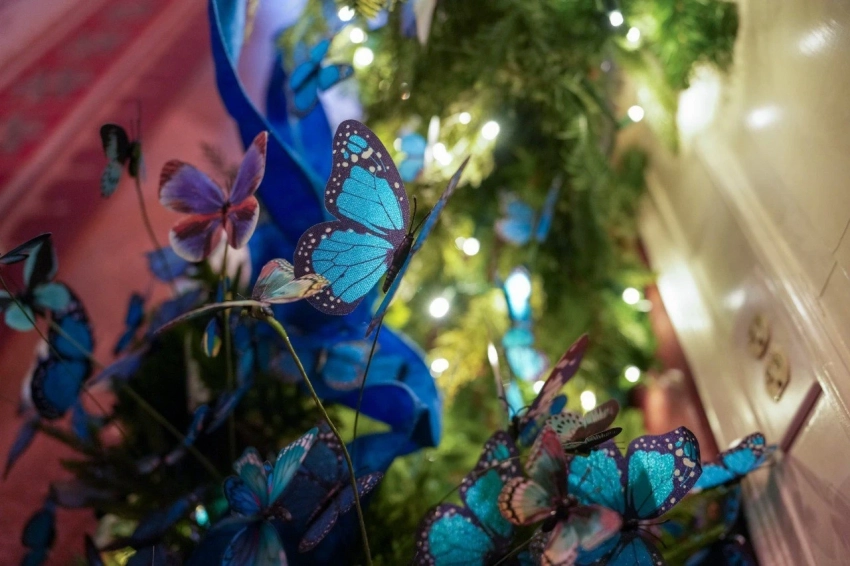 Красная комната украшена тысячами синих бабочек, которые олицетворяют инициативы первой леди Be Best и Fostering the Future, направленные на поддержку молодежи и детей, воспитывающихся в приемных семьях.