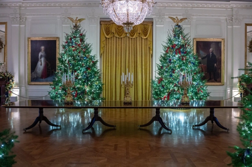Деревья в Восточной комнате оформлены в красном, синем и белом цветах, а также с использованием национальной символики, включая верхушки в виде золотых орлов, что подчеркивает предстоящее празднование America 250.