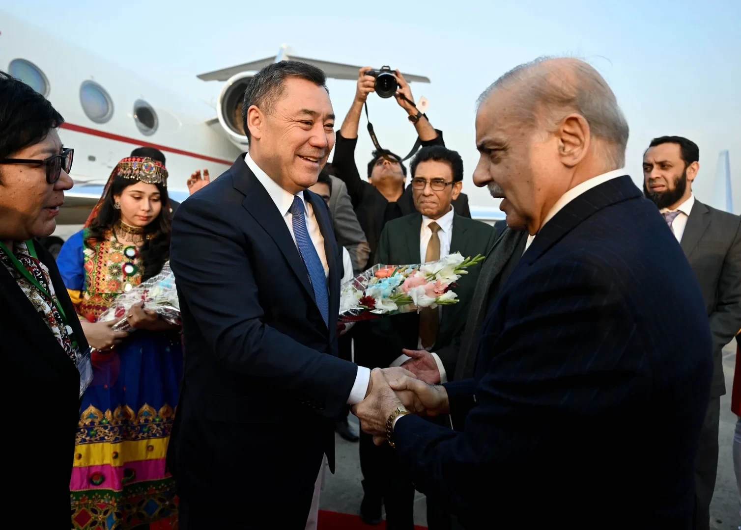В ходе своего государственного визита в Пакистан, президент Садыр Жапаров был встречен на аэродроме президентом Пакистана Асифом Али Зардари и премьер-министром Шахбазом Шарифом, как сообщил пресс-секретарь президента Аскат Алагозов.