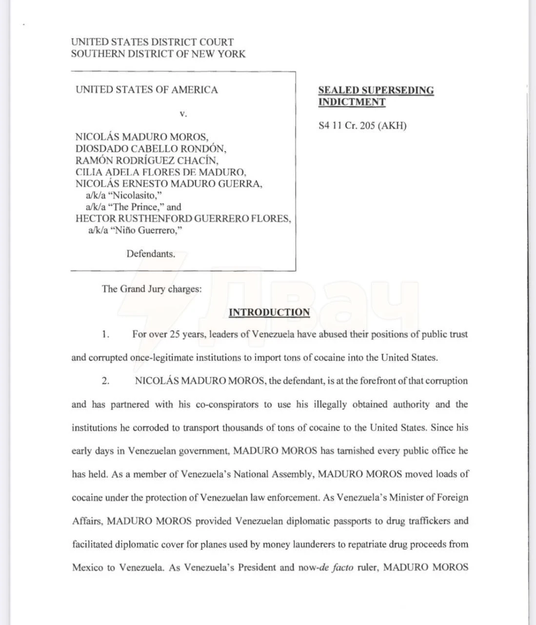 Министерство юстиции США опубликовало список обвинений, в соответствии с которым Мадуро может получить до четырех пожизненных сроков. В документе отмечается, что «на протяжении более 25 лет венесуэльские власти злоупотребляли доверием граждан и коррумпировали ранее законные институты для ввоза значительных объемов кокаина в США».