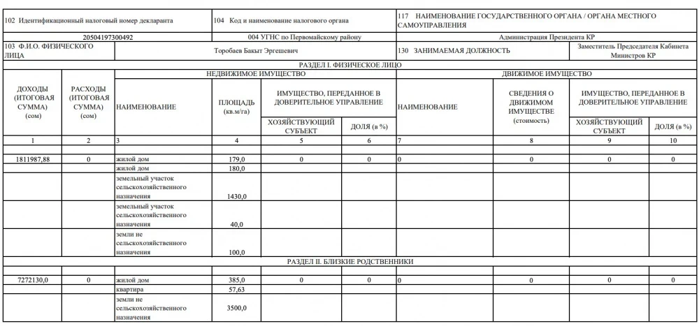 Как министр сельского хозяйства и замглавы кабмина, Торобаев указал доход в 1 млн 811 тыс. 987,88 сома, не сообщив о расходах. В его собственности два дома (179 и 180 кв. м) и три земельных участка общей площадью 0,7 га. Родственники отчитались о доходах в 7 млн 272 тыс. 130 сомов и владеют домом (385 кв. м), квартирой в 56 кв. м и земельным участком в 3 500 кв. м. Судя по данным прошлых лет, они зарабатывали больше.