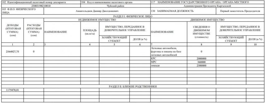Амангельдиев отрапортовал о доходе в 2 млн 544 тыс. 927,75 сома, но не указал свои расходы. У него нет автомобиля, однако он владеет крупным и мелким рогатым скотом, стоимость которого составляет 4,86 млн сомов. Его родственники сообщили о доходе в 1 млн 175 тыс. 470 сомов.