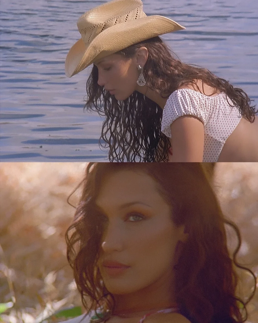 Белла уже более 15 лет сотрудничает с брендом Frankies Bikinis, а теперь создала с ним совместную коллекцию купальников в ковбойском стиле. На новых снимках Хадид демонстрирует некоторые модели купальников, а также позирует в них во время купания и езды на лошади.