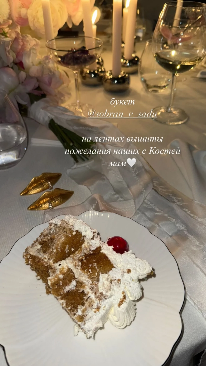 https://t.me/spletnik2006/27322К гостям, которые в качестве пригласительных получили шоколад ручной работы, невеста вышла в классическом белоснежном платье Valentin Yudashkin Couture и с букетом, перевязанным лентами с пожеланиями от матерей невесты и жениха. По ходу вечера Степанова примерила ещё два образа. В качестве подарков присутствовавшие на торжестве получили свечи с особым ароматом свадьбы, которые залили в фарфоровые пиалы со снимками из свадебной фотосессии.