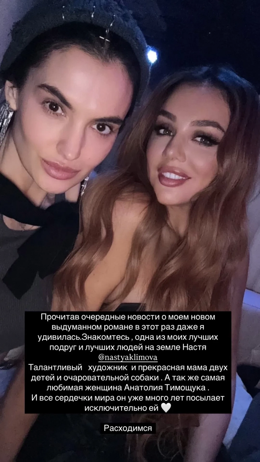 Анатолий Тимощук и Анастасия КлимоваВ подтверждение своих слов артистка опубликовала снимок с подругой и написала: "Прочитав очередные новости о моём новом выдуманном романе, в этот раз я даже удивилась. Знакомьтесь, одна из моих лучших подруг и лучших людей на Земле — Настя. Талантливый художник и прекрасная мама двух детей и очаровательной собаки. А также самая любимая женщина Анатолия Тимощука. И все сердечки мира он уже много лет посылает исключительно ей".