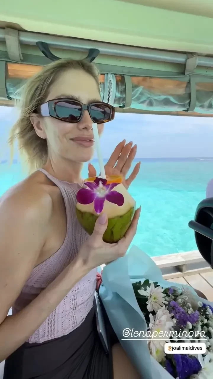 Помимо вида из иллюминатора и интерьера бунгало, манекенщик добавил видео, на котором Перминова запечатлена с букетом цветов и кокосом, а также совместный снимок. К последнему он добавил подпись: "Воссоединился с тобой", сопроводив её эмодзи в виде сердца.
