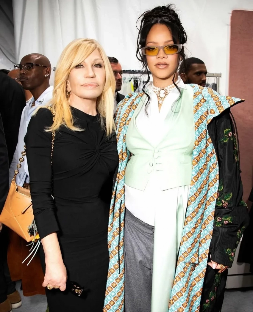 Донателла Версаче и РианнаПозже тем же вечером Рианна вместе с младшим сыном Риотом посетила показ бренда AWGE, который основал A$AP Rocky. Мама и малыш сидели в первом ряду и активно поддерживали рэпера в его звёздный час. Одета певица была в чёрную мини-юбку, частично застёгнутую полосатую рубашку, серые гольфы и остроносые туфли с завязками. Образ дополняла одна из набирающих популярность сумок авторства Джонатана Андерсона, которые выполнены в виде обложек популярных книг.