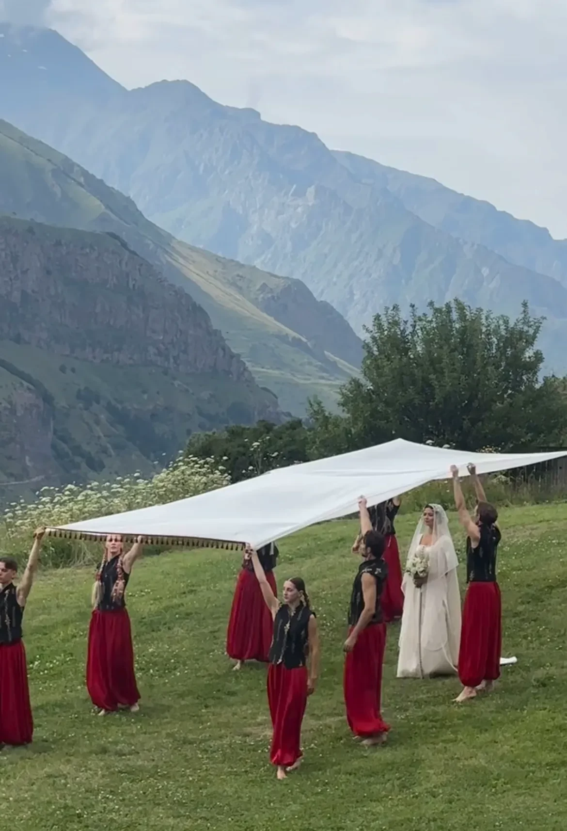 Традиционную грузинскую свадьбу отгуляли в отеле Rooms Kazbegi в Степанцминде, у подножья горы Казбек. Многочисленные родственники и друзья пары нарядились в национальные костюмы, наслаждались выступлениями местных артистов и народными танцами в исполнении жениха и невесты.