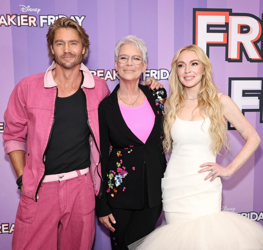 Звезда надела на премьеру белое платье Jacquemus с асимметричной юбкой и золотые босоножки на каблуках. На дорожку также вышли коллеги Линдси по фильму — Джейми Ли Кёртис и Чад Майкл Мюррей.