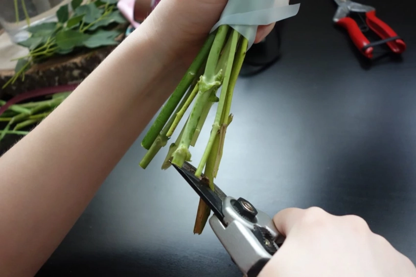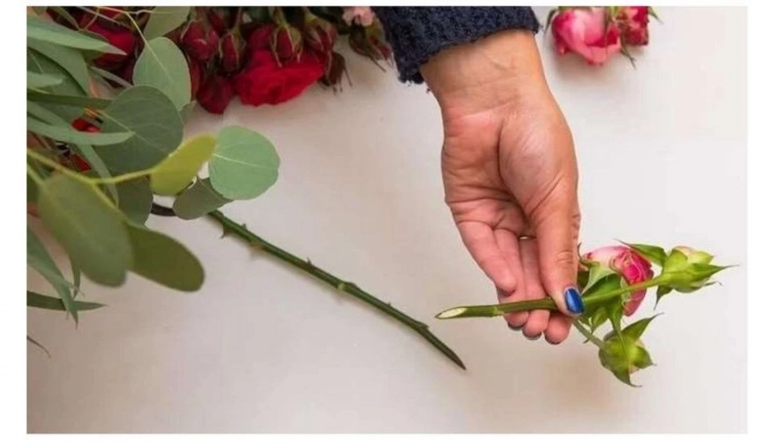 Перед тем как поставить букет в воду, зачистите стебли: снимите все листья и шипы, которые могут оказаться в воде. Влага, контактирующая с зеленью, приводит к гниению и ускоряет увядание цветов. Шипы удаляйте осторожно, чтобы не повредить кору — глубокие надрезы могут нарушить капилляры, и растение не будет получать влагу.