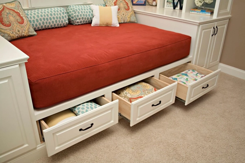 - Кровать с выдвижными ящиками для белья, сезонной одежды и обуви.
