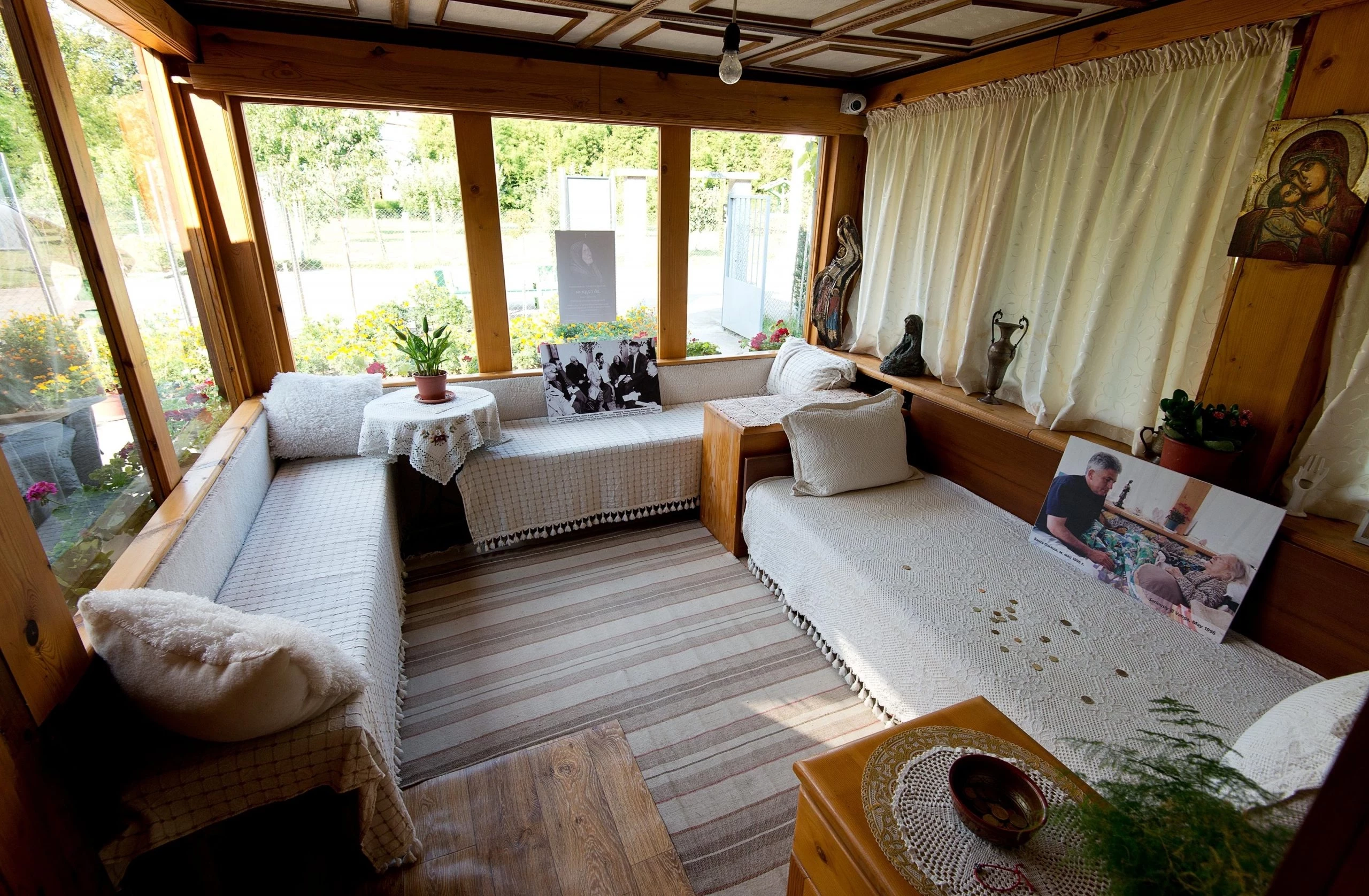 Неподалёку стоит низкая кровать с грубым покрывалом — Ванга не любила роскошь и спала на твёрдом матрасе. На стенах висят фотографии тех, кому она помогла, а в углу — икона, перед которой провидица молилась.