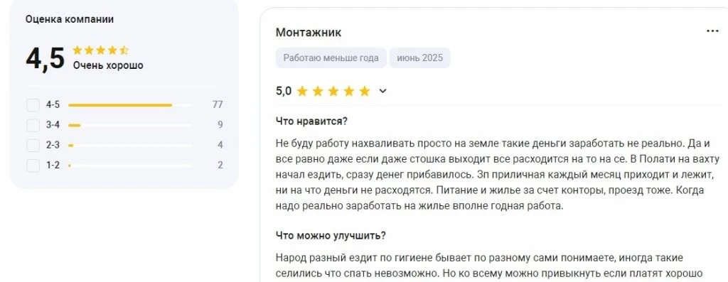 Вахтовая смена длится в среднем 60–80 дней, график работы плотный — по 11-12 часов в сутки. Не все готовы к подобным нагрузкам, кроме того, на моральном состоянии некоторых сотрудников не лучшим образом сказывается удаленность от дома, семьи. Среди существенных недостатков, который часто фигурирует в отзывах сотрудников «ПОЛАТИ», можно встретить информацию о том, что межвахтовый период (он длится 30 дней) компания не оплачивает.