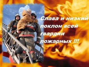 Поздравляю с профессиональным праздником – Днем пожарной охраны! Ваш труд нелёгок и полон опасностей, поэтому от всей души желаю вам сохранять бдительность и мужество на каждом шагу. Пусть огонь горит лишь в сердце от страсти и вдохновения, а пламя счастья всегда согревает вашу душу.