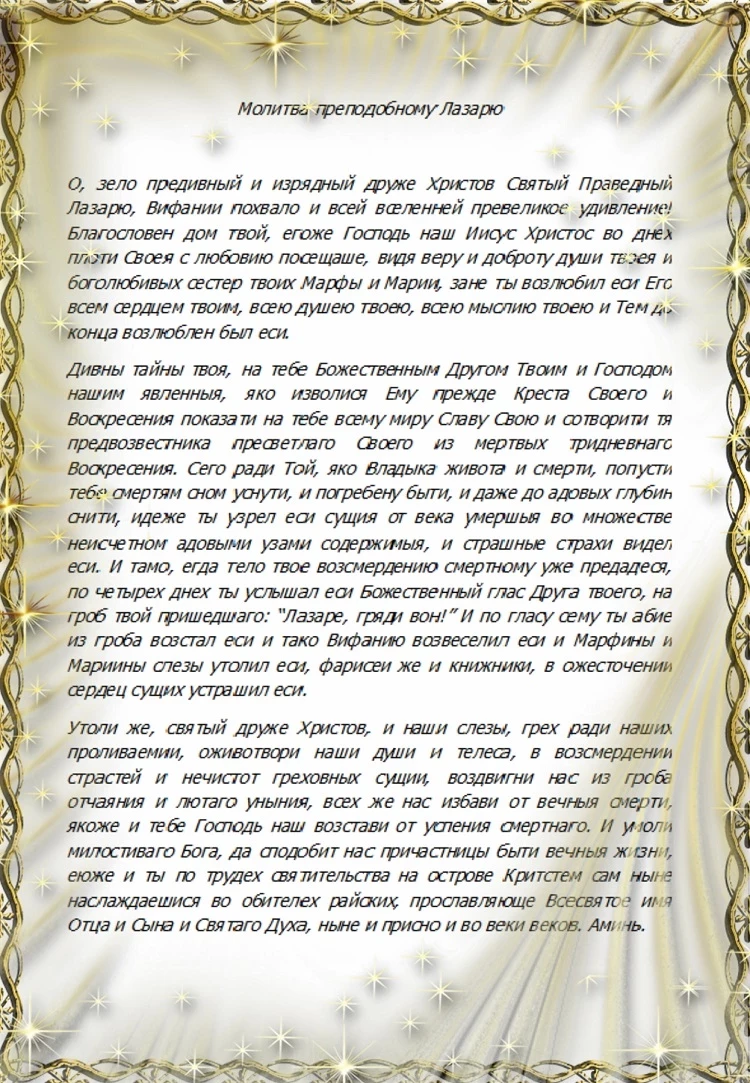 Согласно церковной традиции, обращаясь к святому Лазарю, важно давать обет добрых дел — пообещать благие поступки в благодарность за помощь. Считается, что если человек нарушит это обещание, болезнь или беда могут вернуться.
