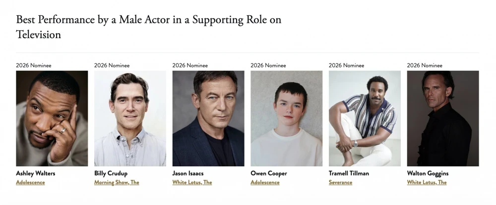 В категории сериалов лидирует "Белый лотос" с шестью номинациями, в то время как "Переходный возраст" имеет пять, а "Убийства в одном здании" и "Разделение" — по четыре.