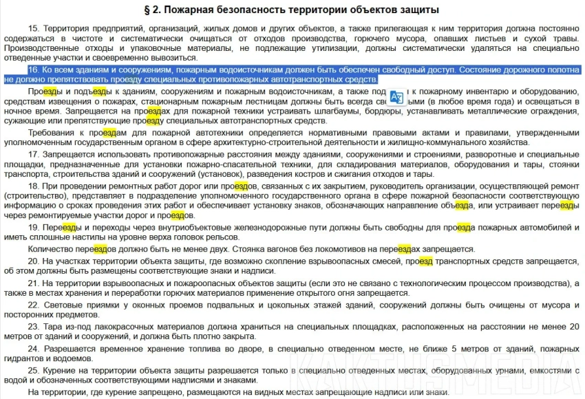 Согласно пункту 16 главы 2 Правил пожарной безопасности КР, свободный доступ должен быть обеспечен ко всем зданиям и пожарным водоисточникам, а состояние дорог не должно препятствовать движению специализированных пожарных автомобилей.