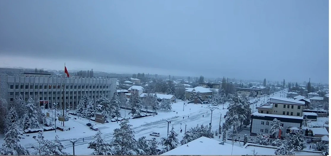 С утра город засыпало густым снегом, улицы и площади полностью укрыты белым слоем. На площади Ала-Тоо наблюдается плохая видимость, деревья и автомобили покрыты снегом, движение затруднено. Коммунальные службы работают в усиленном режиме, чтобы справиться с последствиями стихии.