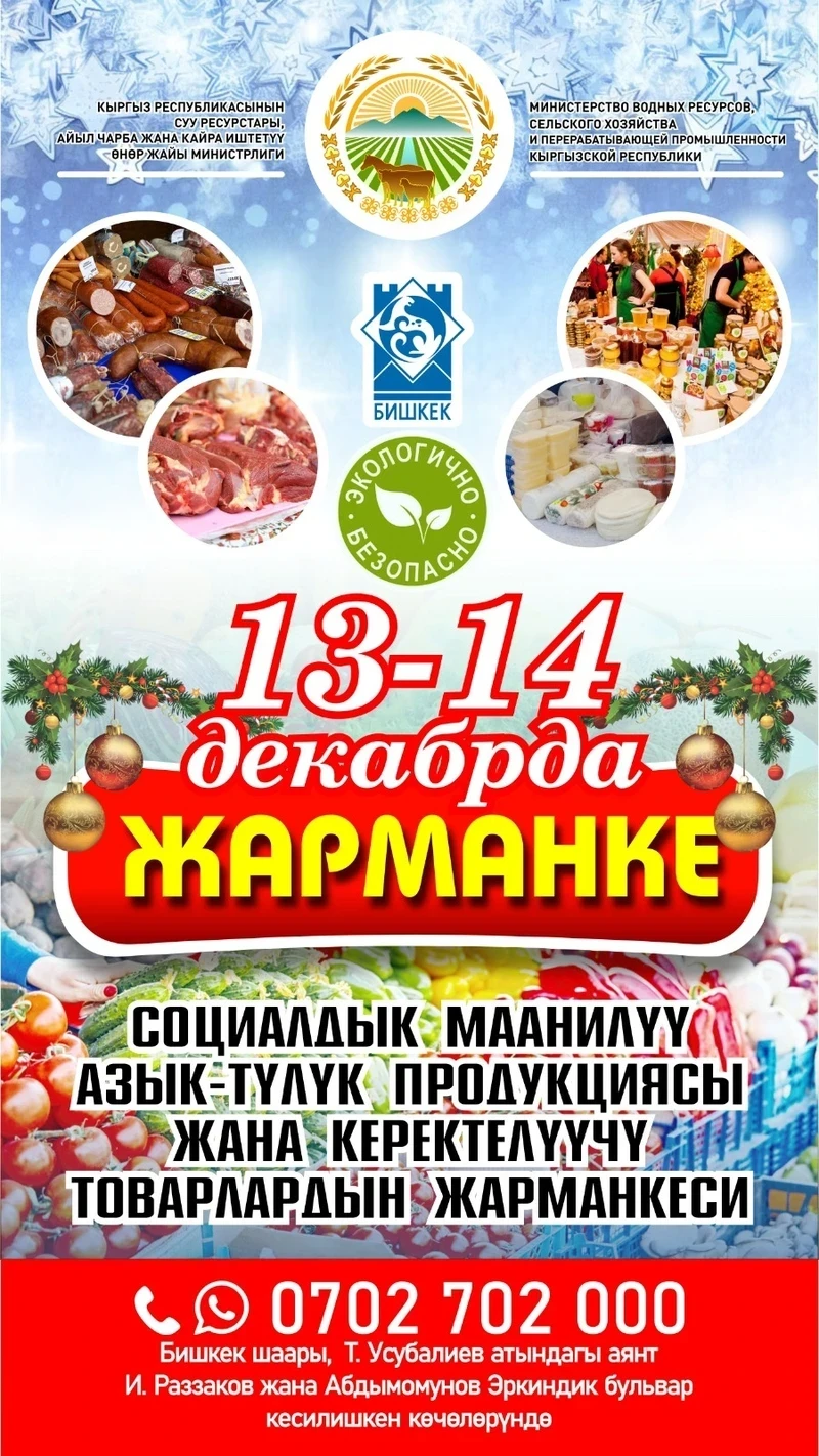 Каждые выходные, в субботу и воскресенье, ярмарки в Бишкеке проводятся совместно с мэрией города, предлагая жителям товары по ценам ниже рыночных.