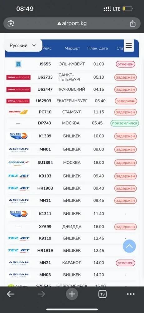 В аэропорту Оша ситуация значительно лучше — видимость улучшилась, и самолеты приземляются с увеличенной частотой.