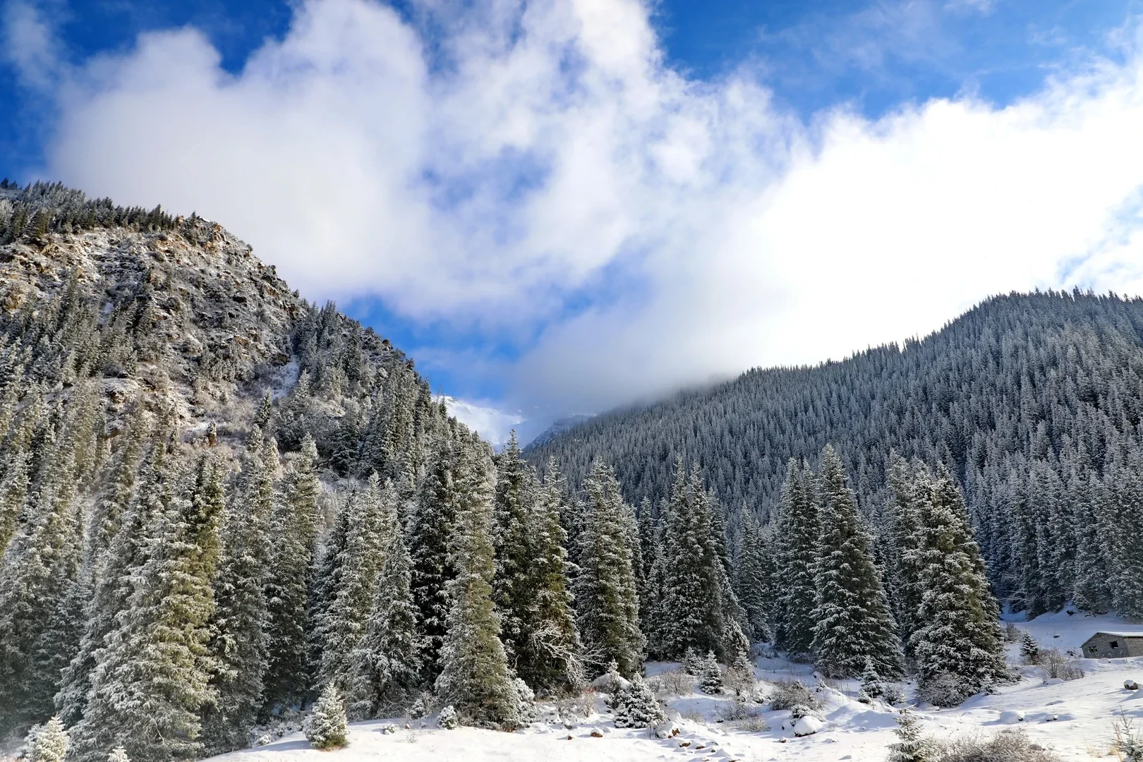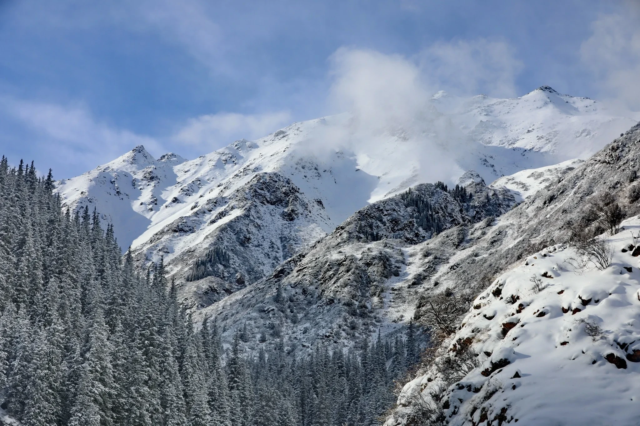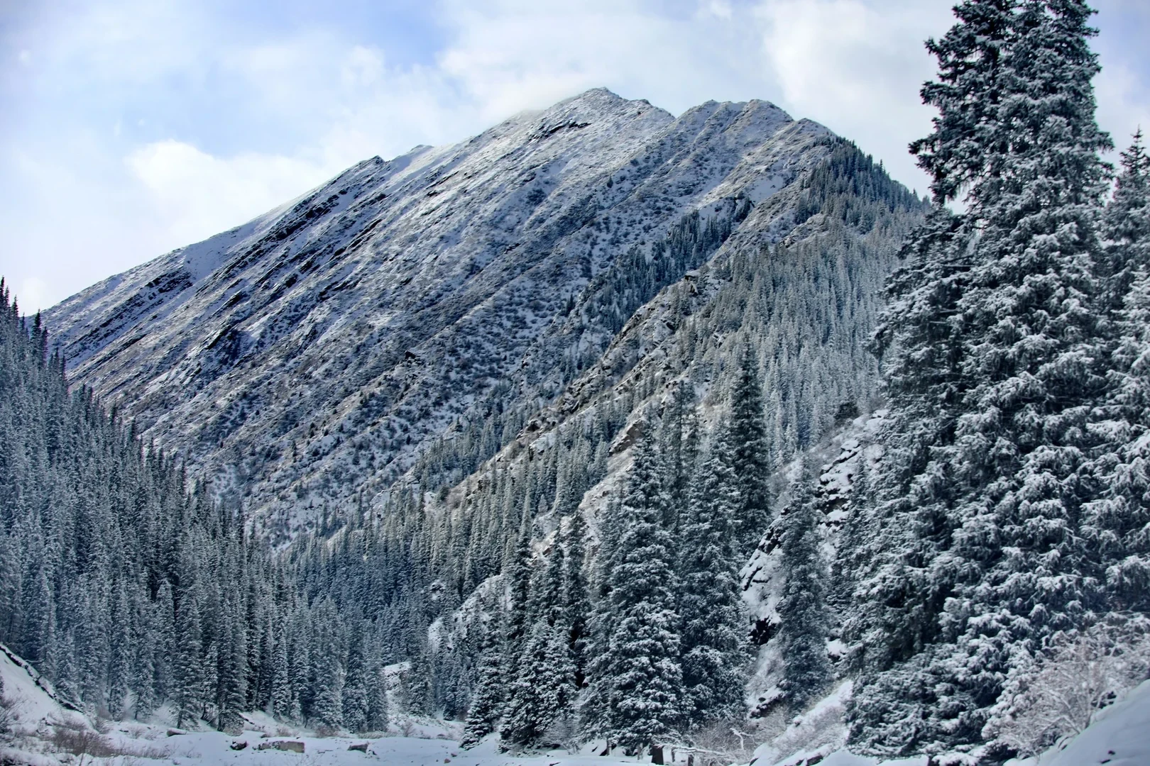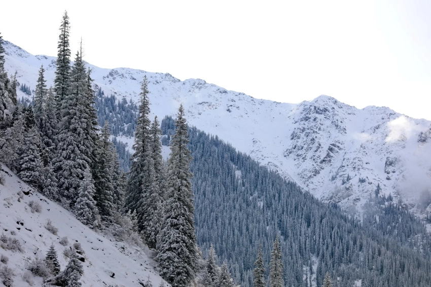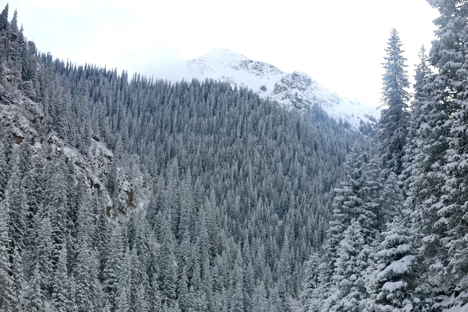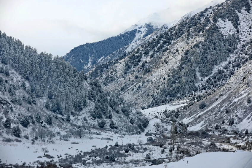 Далее по ущелью рельеф резко изменяется: дно поднимается на 200 метров, а лес смещается к левому борту. С каждым пройденным километром тянь-шаньских елей становится все больше, склоны плотно покрываются лесом, а ущелье наполняется тишиной, свойственной только зимним горам.
