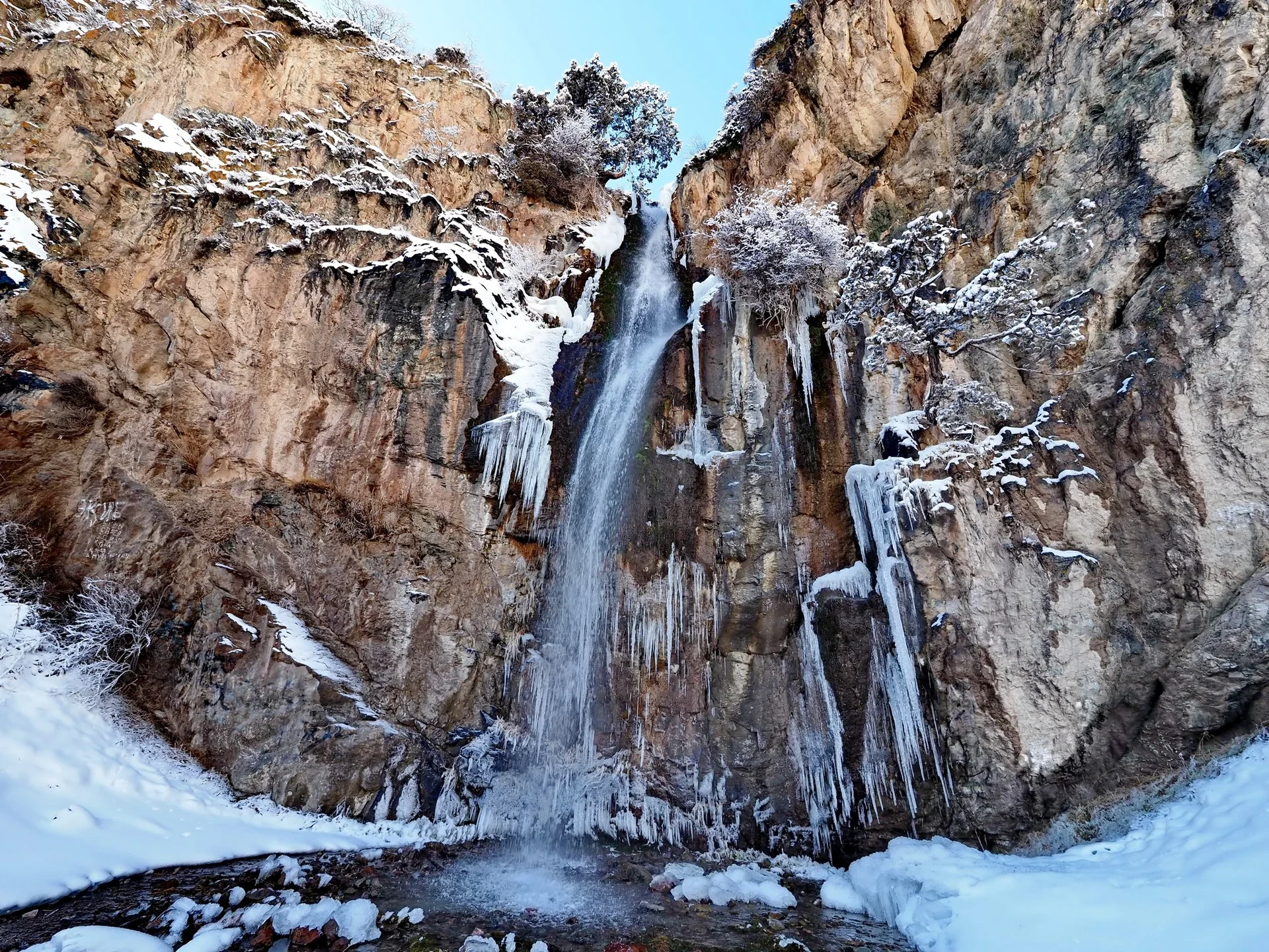 У начала ущелья склоны украшены арчой, шиповником, рябиной и барбарисом, которые зимой выглядят как темные силуэты, выступающие из снега. В сердце ущелья находится водопад высотой около 20 метров, который в сильные морозы частично замерзает, превращаясь в внушительную ледяную стену.