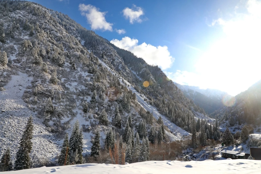 Двигаясь дальше, вы попадете в ущелье Ат-Джайлоо, расположенное примерно в 11 километрах от лесничества, где заброшенные шахты зимним днем выглядят особенно загадочно на фоне снежных склонов.