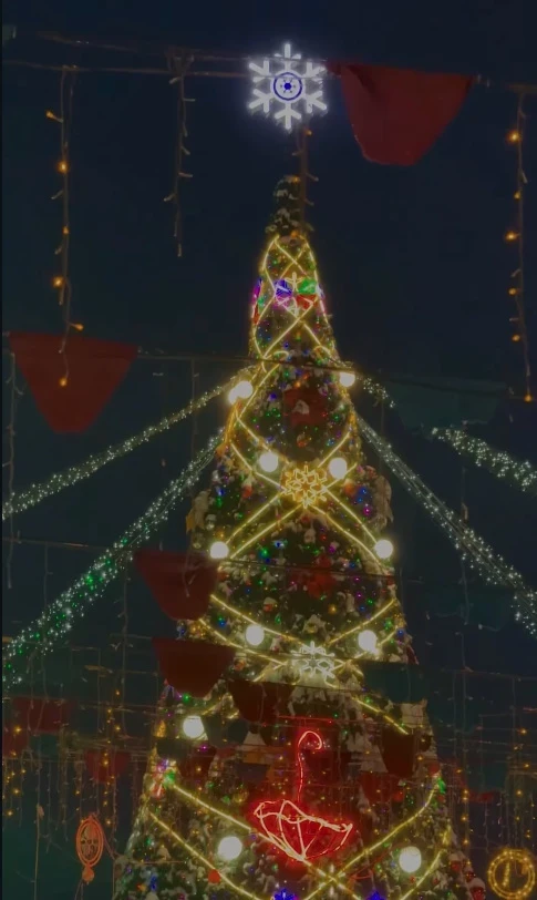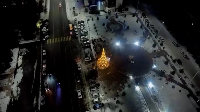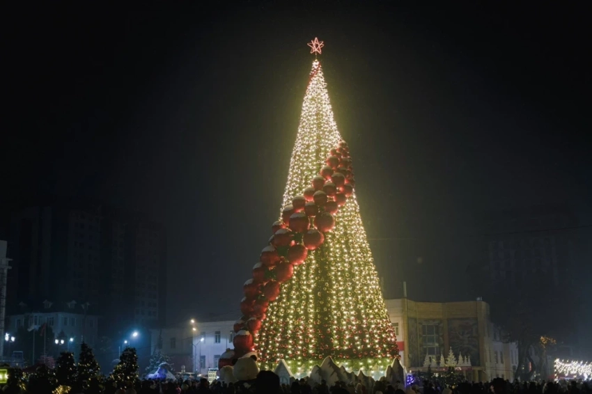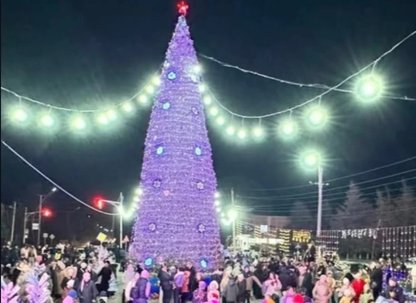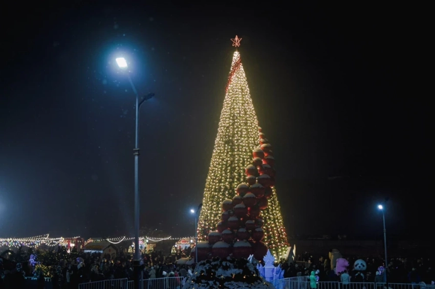 В Токмоке также установлена новогодняя елка, которая украшена длинными гирляндами, создающими атмосферу праздника.