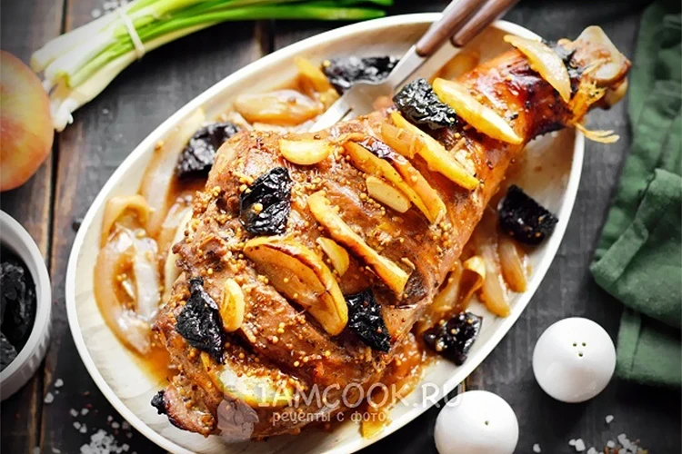 Закройте голень фольгой и запекайте в разогретой духовке в течение 1,5 часов. За 15 минут до конца запекания откройте фольгу для образования румяной корочки. После остывания нарежьте мясо и подавайте с подливкой, яблоками и черносливом.
