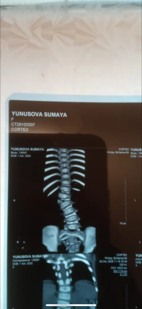 «Узнав, что ничего не помогает, мы обратились за консультацией к турецким профессорам. Они заявили, что единственный выход — операция, и чем быстрее она будет проведена, тем лучше для роста и развития Сумаи. Кроме того, мы узнали, что у неё есть лишняя кость на позвонке, что также является последствием сколиоза», - сообщает мама.