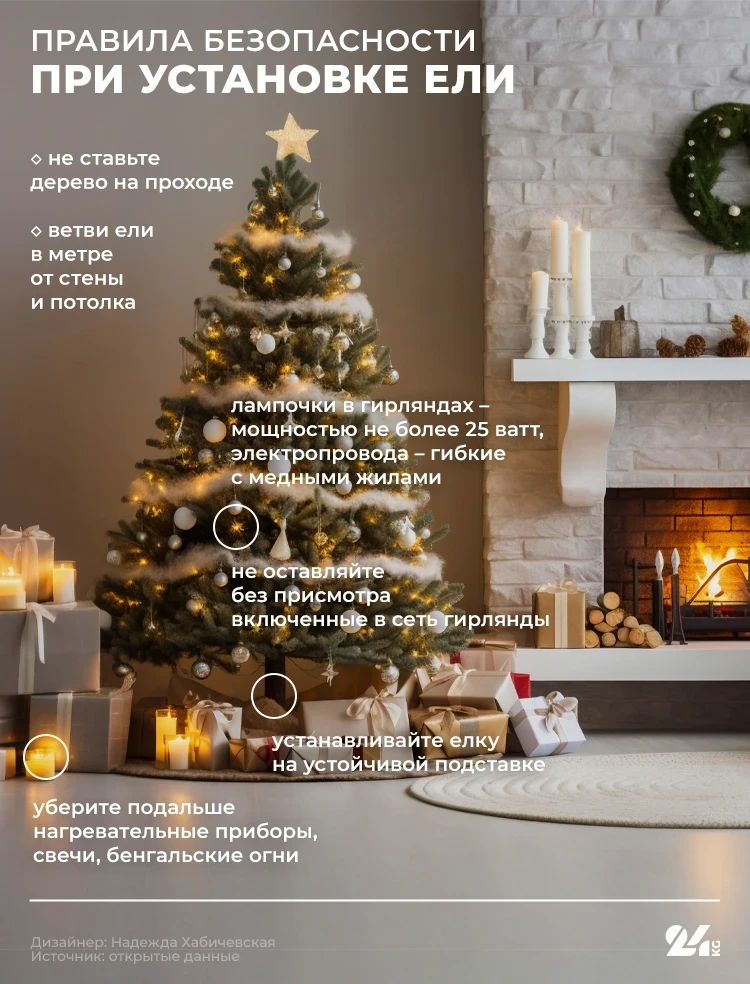 Чтобы избежать неприятностей, важно строго соблюдать правила пожарной безопасности при установке елки. Дерево не должно препятствовать эвакуации людей в случае возгорания. Если искусственная елка загорится, не трогайте ее руками — лучше накрыть плотным одеялом.