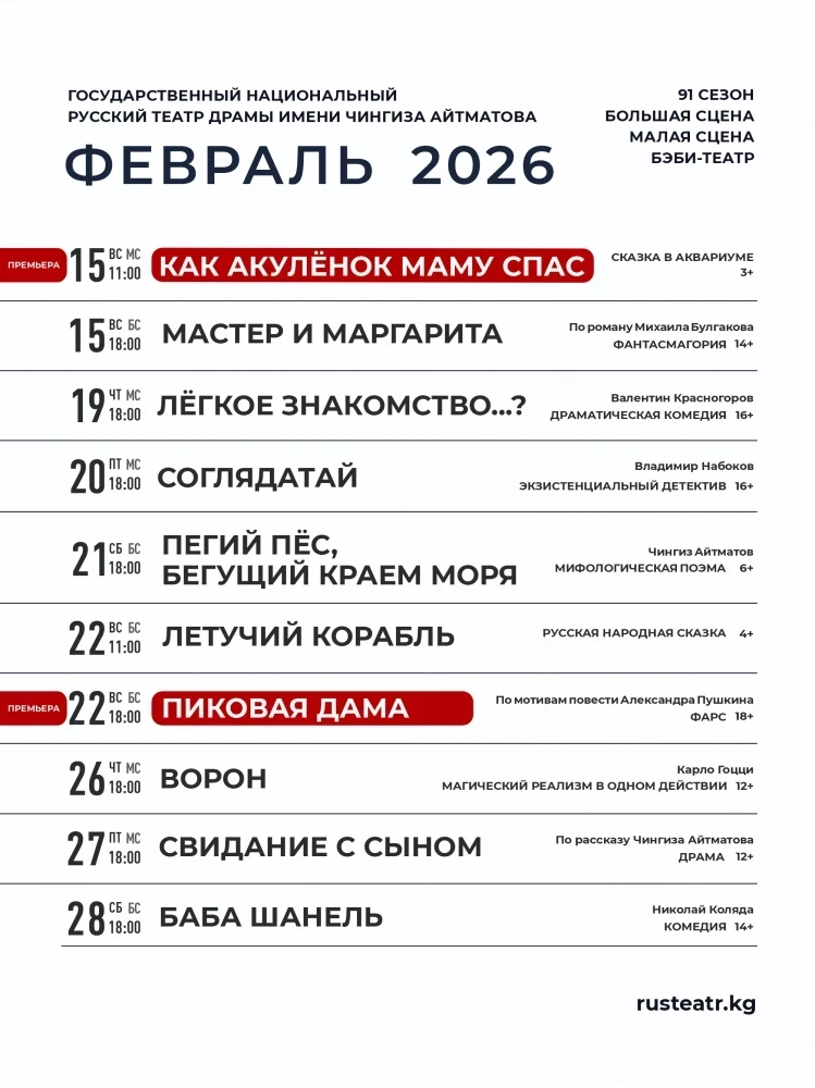 Репертуар Русского театра драмы им. Ч. Айтматова на февраль
