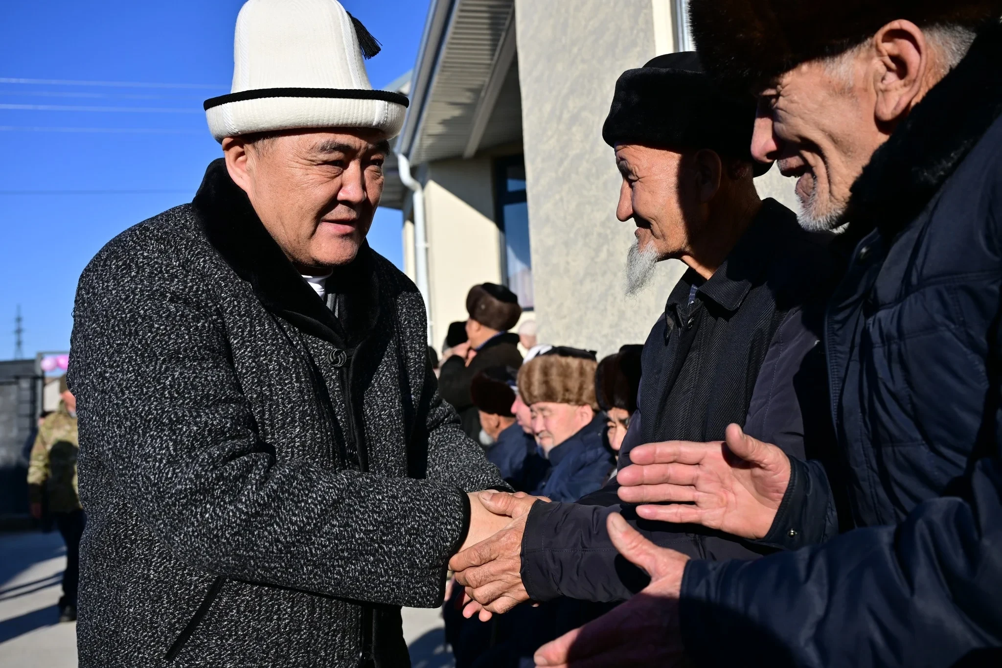 В Сузаке, в Джалал-Абадской области, председатель ГКНБ Камчыбек Ташиев передал ключи от нового дома местному жителю Турдубаю Кожоеву, который на протяжении 17 лет исполняет обязанности молдо в своем селе Барпы.