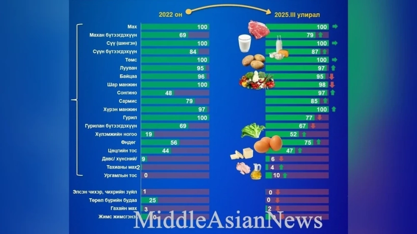 Например, в 2022 году Монголия полностью обеспечивала себя мясом, и этот уровень сохранится до 2025 года. Самообеспеченность мясными продуктами возросла с 69% до 79%, а жидким молоком — оставалась на уровне 100%; молочные продукты увеличились с 84% до 87%.