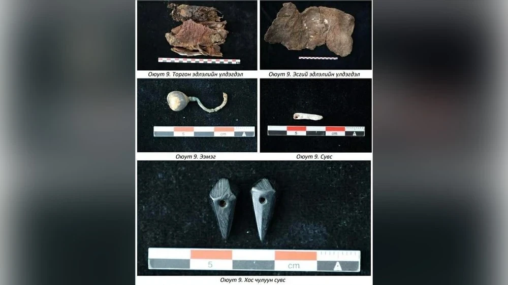 Среди найденных артефактов были бронзовые зеркала (толи), фрагменты войлока, кости животных и различные погребальные подношения. Эти предметы характерны для погребальных обычаев кочевых народов степи, где личные вещи и символические объекты сопровождали усопших в загробную жизнь.