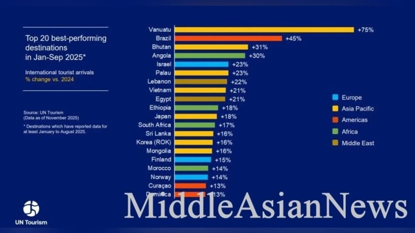 • В Северной и Южной Америке отмечен рост на 2% до сентября 2025 года, с увеличением на 3% в первых двух кварталах, но с небольшим снижением на 1% в третьем квартале. В Ближнем Востоке число прибытий увеличилось на 2% по сравнению с аналогичным периодом 2024 года.