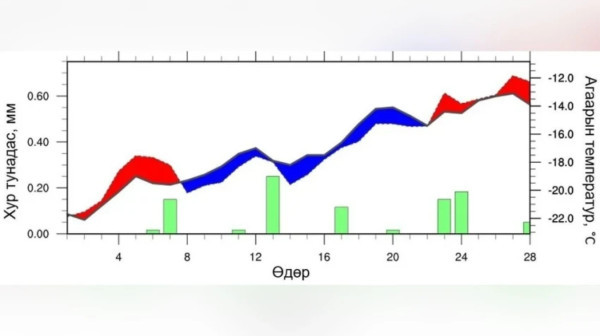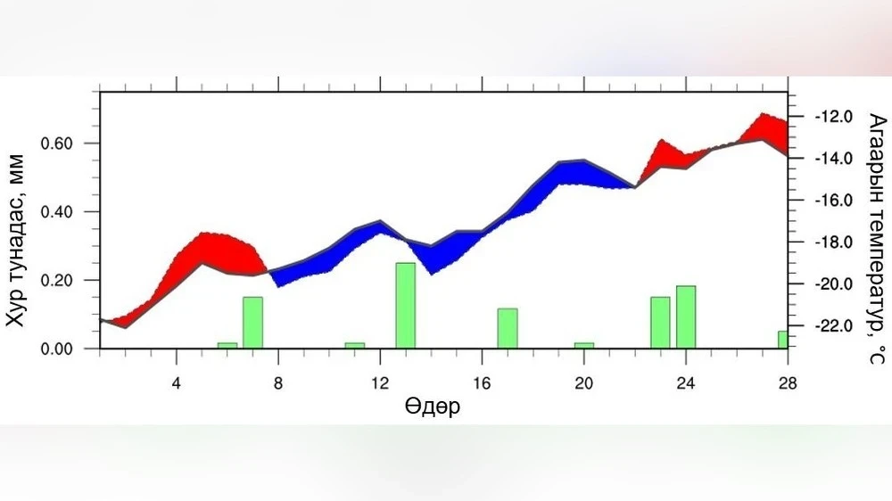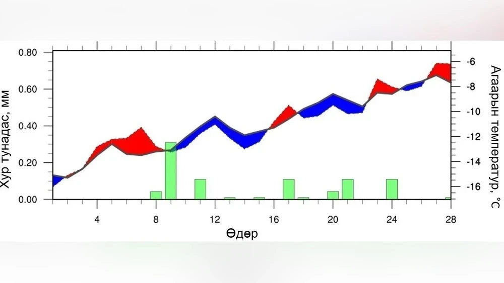 В восточных аймаках в феврале средняя температура воздуха, как ожидается, будет ниже среднемноголетнего уровня, в то время как уровень осадков будет близок к средним показателям в южной части Сухбаатара и выше среднего в других местах. Динамика температуры и осадков представлена на рисунке 9. В начале месяца дневные температуры будут выше средних, однако к концу первых десяти дней, в начале и середине второго десятилетия, а также в начале третьего десятидневного периода температура предсказывается на 1–5 °C ниже среднемноголетних значений.