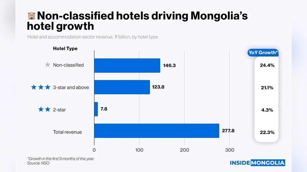 В основном, рост сектора обусловлен отелями, которые не попадают в определенные категории. Эти заведения на данный момент приносят наибольшую долю доходов от размещения. В частности, выручка от неклассифицированных гостиничных услуг увеличилась на 58.5%, составив ₮167.2 млрд в 2024 году по сравнению с предыдущим годом. Также за первые 9 месяцев 2025 года они заработали ₮146.3 млрд, что почти соответствует общему доходу за 2022 год. Основными факторами этого роста стали внутренний туризм, увеличение продолжительности пребывания в городах и гибкие условия размещения, а не открытие новых высококлассных объектов.