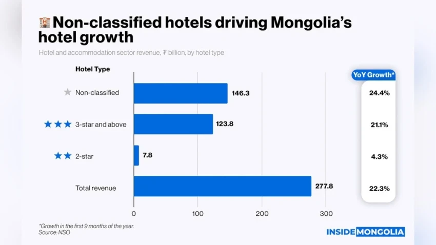 «Согласно последним данным: Национального статистического комитета, доход гостиничного и туристического сектора Монголии за первые три квартала 2025 года вырос на 22.3% по сравнению с тем же периодом 2024 года, составив ₮277.8 млрд», — сообщает InsideMongolia.