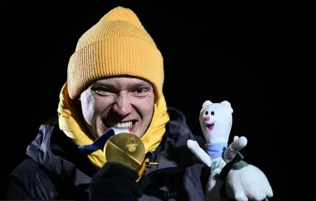 Макс Лангенхан с золотой медалью и талисманами Олимпиады. Фото AFP via Getty Images.